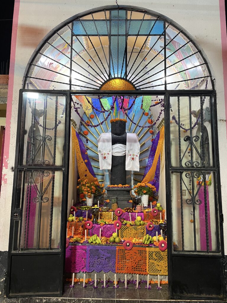 Oploskoffietje gescoord, eerst even in de zon zitten want ‘s ochtends is het in de schaduw nog een beetje koud. Hier staat de machtig grote kathedraal die de Spanjaarden boven op een Azteekse tempel hebben gebouwd. Het is van binnen zo overweldigend dat foto’s maken gewoon geen zin heeft. Dus daarom een klein detail genomen, een bebloede hand.