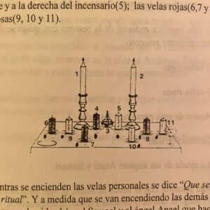 Vervolgens worden de kaarsen op het altaar geplaatst en in de volgende volgorde aangestoken: de altaarkaarsen die aan de achterkant van het altaar worden geplaatst (1 en 2); de wierook die in het midden van de altaarkaarsen wordt geplaatst (3); de persoonlijke kaars van de persoon die om de gunst vraagt, die voor en links van het wierookvat wordt geplaatst, gericht naar het altaar (4); de kaars van de persoon op wie het ritueel is gericht, die naast de vorige kaars voor en rechts van het wierookvat wordt geplaatst(5); de rode kaarsen (6, 7 en 8) en de roze kaarsen (9, 10 en 11). Terwijl je de persoonlijke kaarsen aansteekt, zeg je: ‘Laat er licht zijn in dit ritueel.’ En terwijl de andere kaarsen en wierook worden aangestoken, wordt aan de engel Samael en de engel Anael gevraagd om de liefde die tussen het paar in kwestie bestaat, te laten dienen om hen te verenigen. Alle kaarsen mogen tot het einde branden. Het ritueel moet altijd eindigen met het bedanken van de engelen voor hun hulp.